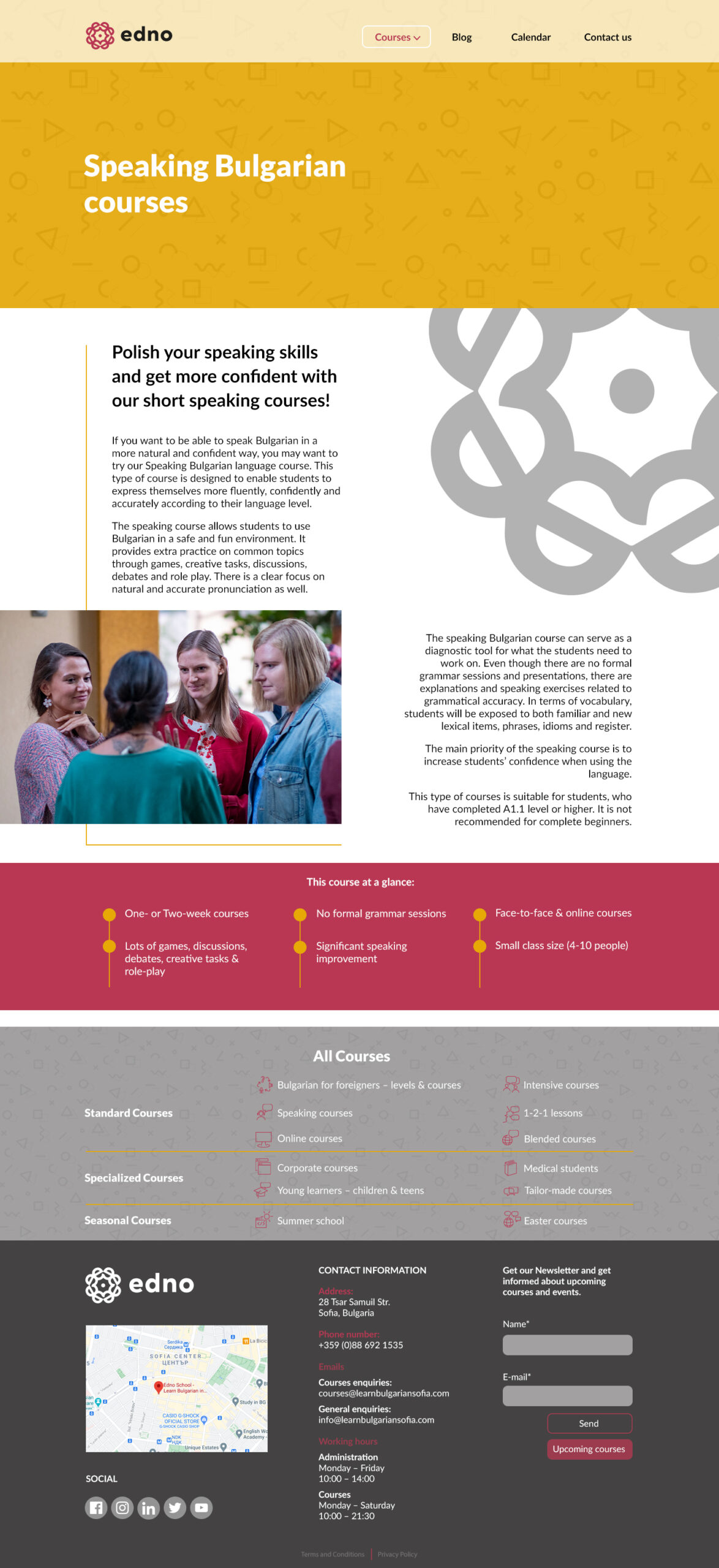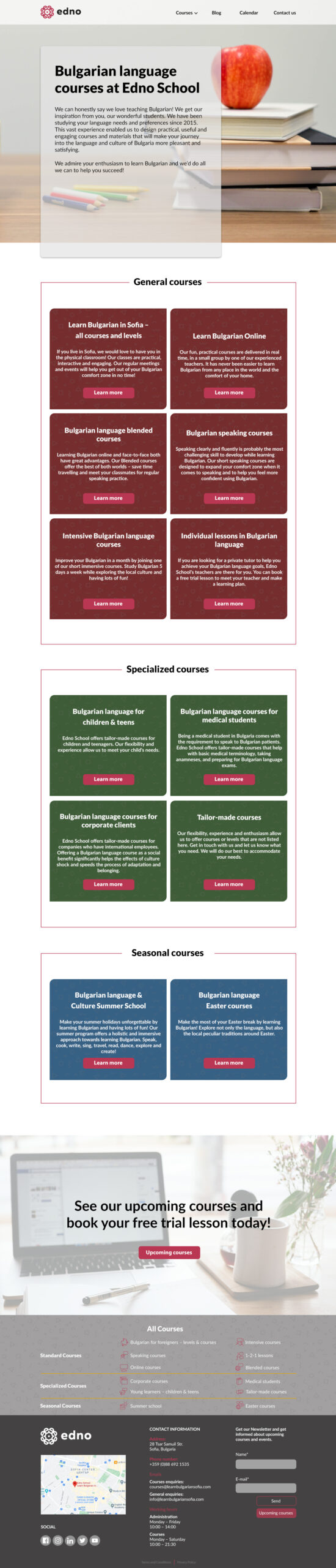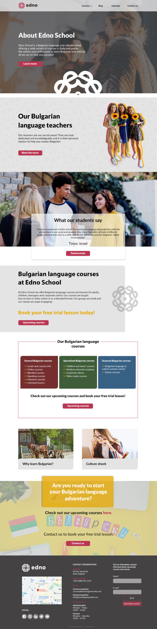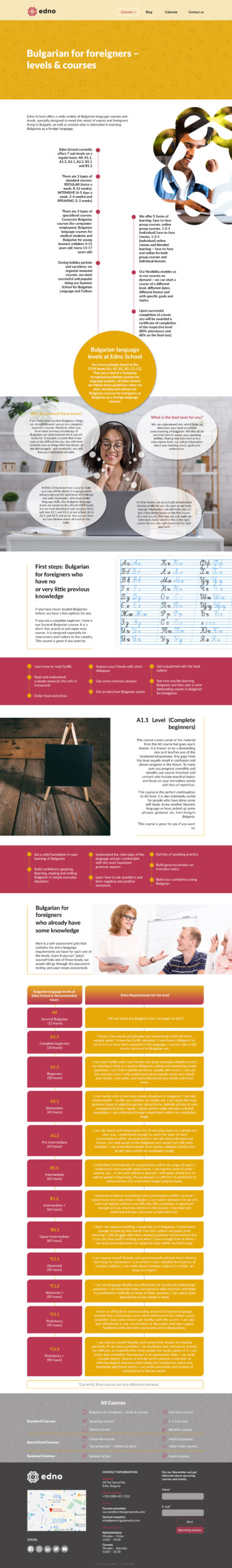 Το έργο αυτό αφορά ένα φροντιστήριο Βουλγαρικών στην Σόφια. Ο πελάτης ήταν ήδη πελάτης μας από τον Αυγουστο του 2016 και είχαμε φτιάξει για αυτόν την ιστοσελίδα learnbulgariansofia.com. Το φροντιστήριό του μεγάλωνε πολύ γρήγορα και το 2020 λόγω covid πήρε την απόφαση να κάνει μαθήματα online. Αρχικα ξεκίνησε με μαθήματα στο Zoom με μικρά τμήματα μαθητών και έναν καθηγητή live. Για αυτόν τον πελάτη η κρίση του covid έγινε ευκαιρία μιας και με αυτόν τον τρόπο επεκτάθηκε σε όλη την Βουλγαρία και προετοιμάζεται να επεκταθεί και στο εξωτερικό. Ο λόγος που κάναμε το δεύτερο site είναι για να μπορέσουμε να ανταποκριθούμε καλύτερα σε αυτό τον στόχο. Το νέο site έχει σαν domain το όνομα του φροντιστηρίου του πελάτη (που είναι πλέον γνωστό στην Σόφια) και αυτή τη φορά έγινε με μακέτες από designer και όχι απευθείας από τον προγραμματιστή. Επίπλέον, είναι δίγλωσσο (Αγγλικά και Βουλγάρικα) και συνδέεται με δυο εφαρμογές. Μια για την δημιουργία ασκήσεων για να κάνουν οι μαθητές εξάσκηση και μια για την προβολή online έτοιμων πλεον μαθημάτων. Τα μαθήματα θα μπορούν οι σπουδαστές να τα αγοράσουν μέσω καλαθιού και αυτά θα είναι μόνο με έτοιμο υλικό και όχι live καθηγητές. Αυτό το διάστημα ο πελάτης μας προετοιμάζει το υλικό μέσα σε αυτά τα 2 apps έτσι ώστε να το εμφανίσουμε στην ιστοσελίδα του.