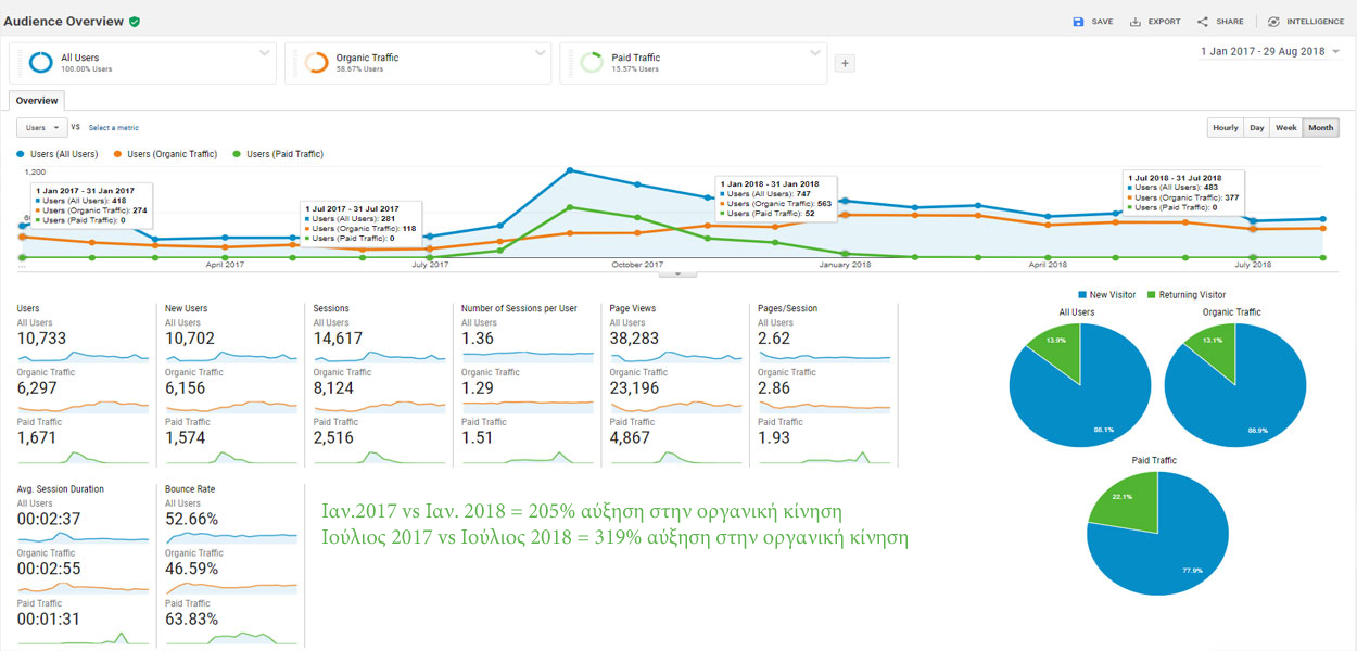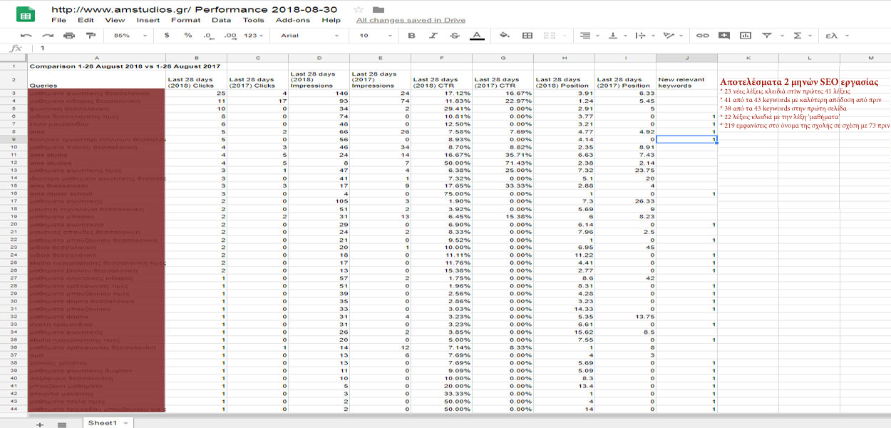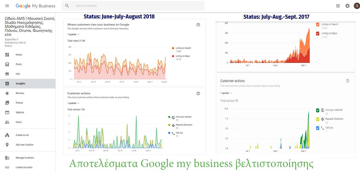 Ο πελάτης μας είχε ήδη μια ιστοσελίδα την οποία είχε κάνει ο ίδιος και αρχικά μας ζήτησε να την προωθήσουμε με διαφημίσεις. Αφού την μελετήσαμε του είπαμε ότι αν τρέχαμε διαφήμιση δεν θα έφαιρνε αποτελέσματα. Επρεπε να γίνουν αρκετές αλλαγές πριν τρέξουμε διαφήμιση. Μας εμπιστεύτηκε και έτσι συνεργαστήκαμε μαζί του για να πετύχουμε το επιθυμητό αποτέλεσμα. Αλλάξαμε αρκετά την δομή της ιστοσελίδας αλλά επειδή δεν υπήρχε αρκετό budget για να κάνουμε μια ολοκληρωμένη νέα πρόταση δουλέψαμε σε ορισμένες σελίδες της ιστοσελίδας. Κυρίως στα μαθήματα που αργότερα θα προωθούσαμε και στην κεντρική σελίδα. Παράλληλα με αυτές τις αλλαγές κάναμε και βελτιστοποίηση των στοιχείων του ωδείου στο Google maps (google my business) έτσι ώστε να βοηθήσουμε και τα αποτελέσματα της οργανικής κίνησης αλλά και τα αποτελέσματα της διαφήμισης της Google. Τα αποτελέσματα ήταν καλύτερα από ότι και εμείς τα περιμέναμε σε όλους τους τομείς (διαφήμιση, οργανικά και google maps).